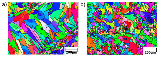 EBSD micrographs (IPFs) of LMD-processed HiperFerAM: (a) 3 mm of beam diameter, showing rod-shaped grains (in the center region), adjacent to equi-axed grains and fine grain formation in re-molten regions; (b) 0.66 mm beam diameter, depicting less and thinner rod-shaped grains in the center and generally smaller grain size.