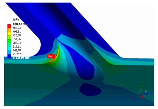 According to the fracture-mechanics based damage tolerance concept, crack propagation rate is a crucial factor, controlling the residual lifetime of components and the estimation of in-service inspection intervals. To exemplarily illustrate this, we calculated the effect of the measured crack propagation rates on the growth of a postulated initial crack in the experimental vessel (outlined in Section 2.1, cf. Figure 1 and Figure 25). The stress calculation was carried out by applying the finite element analysis (FEA) software package ANSYS 19.2. The calculated von Mises equivalent stress in the stress concentration area around the nozzle intersection of the pressure vessel under an internal pressure of 133.1 bar (permissible pressure according to technical code []) is given in Figure 26.