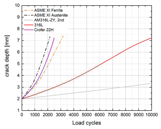Figure 27 and Figure 28 display the impact of the measured crack propagation rates in calculated crack growth diagrams at ambient and elevated temperatures, respectively. In both diagrams, the standard crack propagation rates for ferritic and austenitic steels (in air) according to the ASME Boiler and Pressure Vessel Code [] are included for comparison to the crack propagation rates measured at 316L, Crofer22 H, and HiperFer. The results exemplarily show the enormous influence of material inherent resistance to crack growth on fatigue exhaustion and residual lifetime of components.