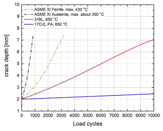 Calculated growth of a postulated 2 mm deep and 40 mm wide surface crack under cyclic loading (f = 20 Hz, R = 0.1, T = 650 °C) in various materials (ASME curves for comparison) at elevated temperatures.