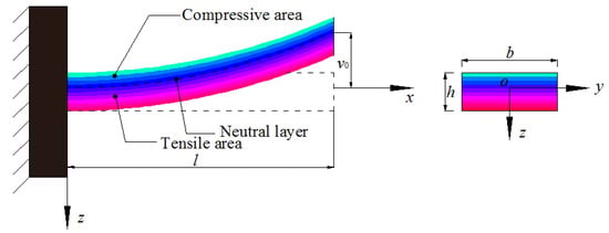 28]. Therefore, unlike a bending beam in static analysis, in the vibration problem here, it seems that there is no definite tensile or compressive area in the beam. For the convenience of the following analysis, however, we assume in this study that the tensile or compressive area is defined in the present of initial displacement, i.e., the upper part of the beam is in compression and the lower part is in tension, as shown in