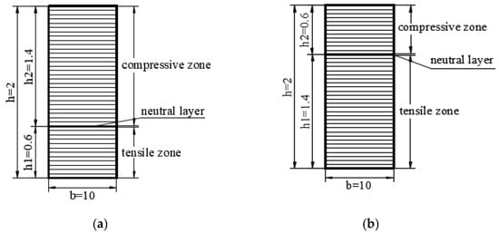 Figure 4. It is easy to see that in case (a), there are 28 layers in the compressive area and 12 layers in the tensile area, while in case (b), the layering is the opposite, that is, 12 layers in the compressive area and 28 layers in the tensile area. The coordinate origin is still on the neutral layer.