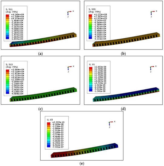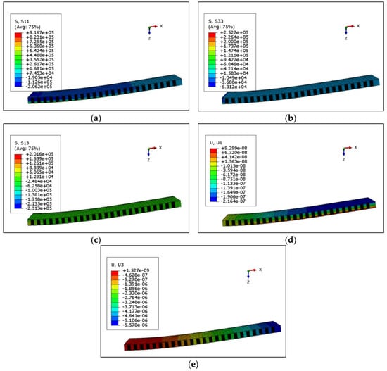 Note that although the numerical implementation in ABAQUS is three-dimensional in the form, we still put out the final results in the form of two-dimensional case, including three stresses, , and , as well as two displacements, and , which are typical in two-dimensional plane problem. In fact, the studied problem is a two-dimensional plane problem, even in some cases (for example, a slim beam), the problem may be further simplified as a one-dimensional problem, like our analytical solution based on Euler–Bernoulli beam theory.