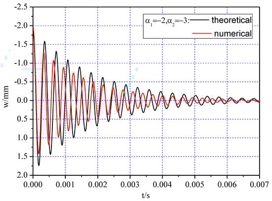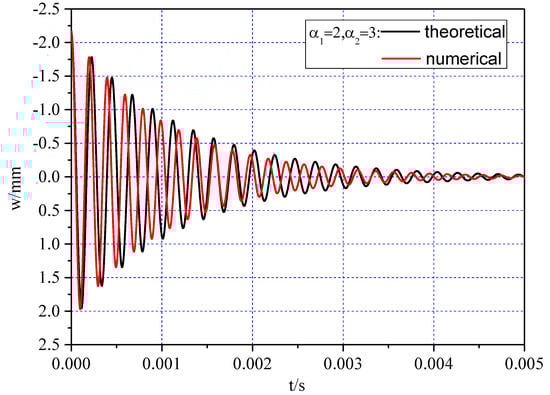 Under two cases, and , the attenuation speed of the vibration from numerical simulation is faster than that from theoretical solution; besides, the attenuation speed in the case is obviously faster than that in the case .