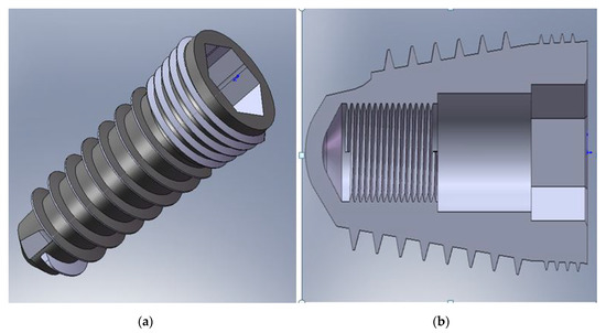 The interior of the implant allowed the insertion with no thread of the intermediate part (abutment) (Figure 2b). At the top, it had a hexagonal reaming used to mount it in the jaw using an Allen key. The inner screw served to assemble the implant with the abutment by a titanium M2 screw (Figure 2b).