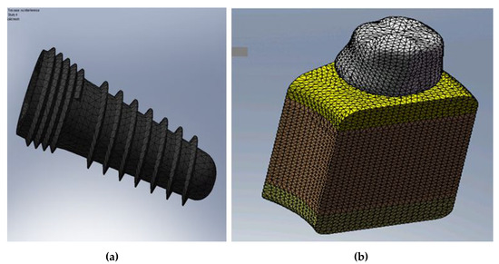 The 3D model used to study an implant in a portion of the jaw was built with the SolidWorks program and used tetraedrale elements in the implant and in the bone tissue as well [21]. The following shows one option of mesh which permits easy the observation of details under consideration. The finite element model consists of the corresponding parts of implant components, as shown in Figure 4a and the supporting bone. Figure 4b represents the finite element (FE) model of the whole system.