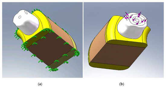 In the FEM models considered in this paper, the lateral faces and bottom of the bone tissue are considered without displacement (nodes movements are fixed on those faces in all directions), (Figure 5a), considering that the influence of the loading no longer exists at that certain distance.