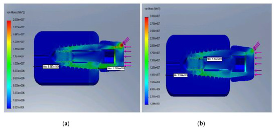 Thus, Figure 6a,b represent the von Mises stress distribution for E minimum (a) and maximum (b), respectively.
