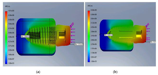 Figure 7a,b represent the displacement distribution for minimum E (a) and maximum E (b), respectively.