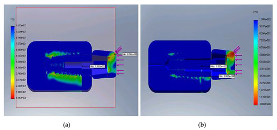 Figure 8a,b represent the safety factor distribution for E minimum (a) and maximum (b), respectively.