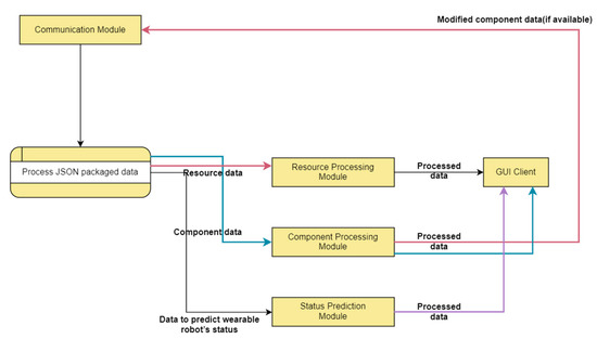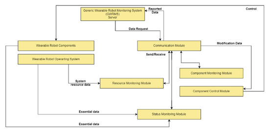 The status-monitoring module is responsible for collecting and reporting the data necessary for predicting the current status of the wearable robot to the server. The status-monitoring module collects data from the resource-monitoring module and the component-monitoring module, and then it organises and reports the data required to predict the status of the wearable robot to the communication module.