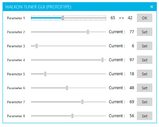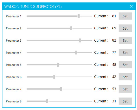 The component-processing module unpacks component data received from the communication module and displays the data in the GUI client, as shown in Figure 5. In addition, using the GUI buttons shown in Figure 5, component parameters can be modified, as shown in Figure 6 (e.g., adjustments to step length, cycle, toe height, and upper-body angle). This will assist in future development of the wearable robot, such as added functions.