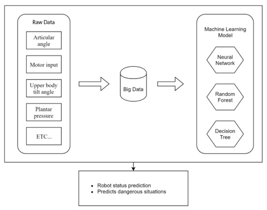 If a machine-learning algorithm is executed based on the data generated by the wearable robot, the data used for analysis are uploaded back to the cloud server, and the learning data are reflected in the machine-learning algorithm. This feedback learning structure is shown in Figure 7.