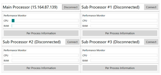 The resource-processing module unpacks the CPU, memory, and resource usage of each process received via the JSON string package through the communication module from each of the robot’s processors, and it displays the data in the GUI client, as shown in Figure 4.