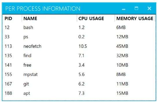 The PID(Process ID) and name of each process can be checked via the resource monitor’s per-process information button, as can CPU and memory usage, as shown in Figure 11. In addition, each item of information can be sorted in ascending or descending order.