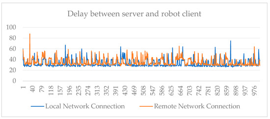 Figure 13 shows the results for the case where local and remote network communication are performed 1000 times with regard to network delay, when the server requests data from the robot system with a wired connection.