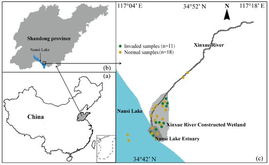 The (a) national, (b) regional, and (c) local geographical setting of the study area. Map (c) showed the sampling sites from the invaded and normal habitats of the four wetlands.