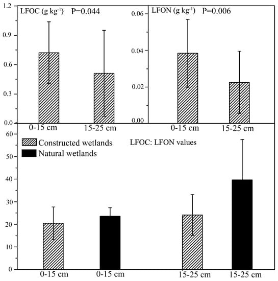 The contents of LFOC and LFON were 0.721 and 0.038 g·kg−1 in the surface sediments (0–15 cm), significantly higher than they were in the subsurface (15–25 cm), at 0.511 and 0.022 g·kg−1 respectively (Figure 2). The accumulation and mineralization of LFs were dynamic and sensitive, and easily affected by climate change, wetland hydrology, and soil physical components [55]. Zhang et al. [20] and Zhang et al. [56] also reported that the OC contents significantly decreased in the soil profiles of reed wetland, paddy field, fens, and humus marsh. As the decomposable fraction, LFs were remarkably decreased in the wetland profile [21,57], which could be caused by their physicochemical lability. In the surface sediments, the effects of wetland types or wetland habitats on the LFs contents were significant, while the effects were mostly insignificant in the subsurface sediments, indicating that the C and N fractions in the surface sediments were easily changed and affected by environmental factors. LFOC:LFON values showed no difference between natural and constructed wetlands in surface sediments, while it was notably higher in natural wetlands than in constructed wetland in the subsurface sediments. Wang et al. [43] indicated the interacting effects on OC and ON but not on the C:N ratio, indicating that the OC and ON might have different distribution patterns affected by the wetland types and depths. In this study, the changes of LFOC:LFON values between the two depths were mostly caused by the higher decreasing rate of LFON (41.66%) than that of LFOC (29.09%) from the surface to the subsurface sediments, which further indicated the sensitivity of LFON to the sampling depths.
