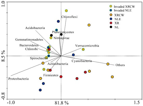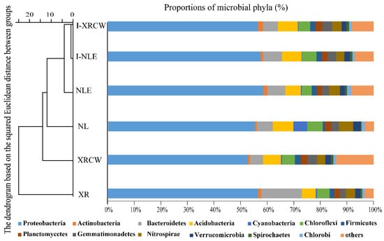 The composition pattern of the bacterial phyla was analyzed and the cluster analysis of the four wetlands that differentiated between invaded and normal habitats was implemented (Figure 4). Cluster analysis showed that the invaded areas were gathered first, and then clustered with NLE, which followed by NL, XRCW, and XR, accordingly. The finding suggested that the alligator weed invasion was a dominant factor that affected the bacterial phyla composition, while the effect of wetland types was not obvious, due to the scattered cluster between natural and constructed wetlands. Specifically, Proteobacteria (55.94%), Bacteroidetes (5.74%), Acidobacteria (6.66%), and Chloroflexi (4.67%) were the dominant bacterial phyla in the studied areas. Among the dominant phyla, Firmicutes was significantly higher in the constructed wetlands (2.01%) than in the natural wetlands (1.43%; adjusted p value of 0.044), while distribution of Gemmatimonadetes was the opposite (adjusted p value of 0.026). Proportion of Cyanobacteria was also very high in the natural wetlands (0.55%) than in the constructed wetlands (0.33%). The results were similar with our previous study on these wetlands, indicating the relatively stable composition of bacterial phyla [21]. Moreover, Adrados et al. [58] showed the significant differences of Bacteroidetes proportions among different wetland units, and it was mostly associated with the degradation of high molecular weight compounds and complex organic particles, such as cellulose and lignin [59,60]. The insignificant distribution of Bacteroidetes in this study indicated its stability under the effects of wetland types and the invaded/normal habitats. Cyanobacteria can reportedly degrade pyrene and other complex organics, and it was very abundant in oil-polluted sediments [61]. Thus, the high proportion of Cyanobacteria in natural wetlands might contribute to the degradation of the C and N fractions, which result in the corresponding low contents, especially in XR. In addition, as a ubiquitous colonizer, Cyanobacteria prefers a high NO3−-N and NH4+-N environment, thus, the higher proportion of Cyanobacteria in natural wetlands than in constructed wetlands might indicate potential eutrophication, especially in NL. Firmicutes was mainly identified as a denitrifier [62], including abundant bacterial taxa that reduce the nitrate into ammonia in anaerobic environment and improve sewage purification in constructed wetlands. Therefore, the high Firmicutes in constructed wetlands and high Cyanobacteria in natural wetlands promote the metabolism of NO3- and NH4+ into ON and ammonia, respectively. Nitrospirae is one typical nitrifying bacteria that oxidize NH3 and NO2- into NO3- [63], it showed no significant difference between the two wetland types or between the invaded and normal wetland habitats, with a mean proportion of 3.58% in this study.