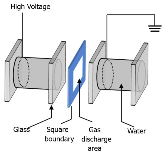 The schematic diagram of the experimental setup is illustrated in Figure 1. Two cylindrical containers with diameter of 7.5 cm filled with tap water were used as the electrodes. The water also served as a coolant and transparent media for observation and measurement of discharge filaments. The water electrodes were sealed with the glass plates with a thickness of 1.5 mm. A metallic ring was immersed in each container and connected to a power supply. A sinusoidal alternating current (AC) voltage at the frequency 10–100 kHz was applied to the left electrode and the right electrode was grounded. A square glass spacing was clamped between two parallel electrodes, serving as a lateral boundary, which determines the distance of the gas gap. The whole apparatus was enclosed in a big container filled with the static gas of different components and different pressures. The voltage waveform and current waveform were detected using a high-voltage probe (Tektronix P6015A 1000×) and a current probe (Tektronix TCP0030A), respectively, which were recorded using a digital phosphor oscilloscope (Tektronix TDS3054B). A camera (EOS 6D) was placed at one end of the electrode to record the images of PPCs.