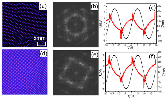 Plasma photonic crystals with different symmetries when increasing of the applied voltage. The left column: snapshots of the triangular plasma photonic crystal (a) and square plasma photonic crystal (d). The middle column: the corresponding Fourier spectra of triangular lattice (b) and square lattice (e). Right column: the voltage-current waveforms associated with the triangular lattice (c) and square lattice (f). The discharge parameters are: (a) the applied voltage U = 5.3 kV, discharge power p = 32 W (d) U = 6.0 kV, p = 46 W. The frequency of the applied voltage f = 55 kHz. The working gas is 100% air. The distance of the gas gap d = 1.1 mm. Gas pressure p = 300 torr and the exposure time t = 40 ms.