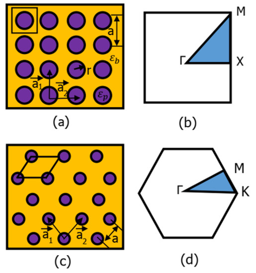 Figure 3 presents the schematic views of the triangular lattice and the square lattice as well as their corresponding irreducible Brillouin zones. The plasma photonic crystal consists of circular plasma columns immersed in air with the dielectric constant εa = 1. For the plasmas, its dielectric constant is frequency-dependent, which can be written as: