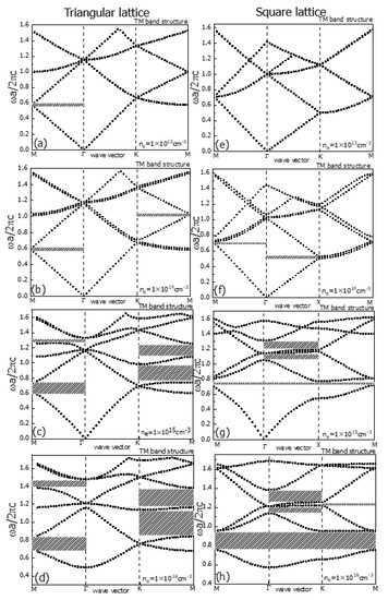 The dispersion relations under different electron densities for the triangular lattice (a–d) and the square lattice (e–h) shown in Figure 2a,b. The shadow strips indicate the positions of the band gaps. The plasma collision frequency = 160 GHz.