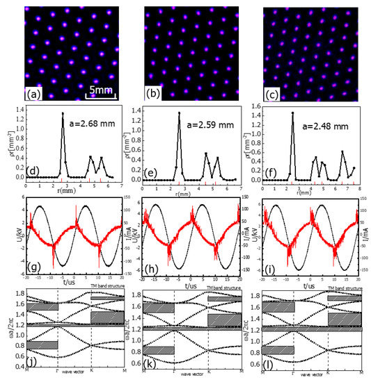 Plasma photonic crystals with reduced lattice constant when increasing of the applied voltage (a–c), the corresponding pair correlation functions (d–f), the voltage-current waveforms (g–i), and the corresponding band diagrams (j–l). The discharge parameters are: (a) U = 4.8 kV, p = 14 W (b) U = 5.8 kV, p = 30 W (c) U = 6.0 kV, p = 34 W. f = 53 kHz, p = 230 torr, d = 2.0 mm, t = 40 ms. The working gas is 40% Ar and 60% air. The red short lines at the bottom of (d–f) indicate the positions of peaks for ideal triangular lattices. The electron density is set as 1015 cm−3 [36,38,39,40], = 60 GHz.
