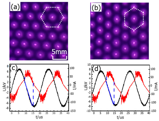 Reorientation of the triangular lattices when increasing of the applied voltage. (a,b): snapshots of the plasma structures. (a) U = 7.4 kV, p = 52 W (b) U = 7.6 kV, p = 56 W. The other discharge parameters are: f = 53 kHz, p = 440 torr, d = 2.0 mm, t = 40 ms. The working gas is 65% Ar and 35% air. The white dotted hexagons indicate the angular reorientation of the plasma photonic crystals. (c,d): the corresponding voltage-current waveforms associate with the triangular lattices of different orientations. The blue lines on the voltage waveforms indicate the ranges of the voltages that the discharges occur.