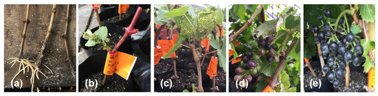 Developmental stages of ‘Malbec’ fruiting cuttings. (a) cuttings showing root development on removal from the heated container after four weeks; (b) budburst; (c) fruit set; (d) veraison; (e) the same cluster at harvest.