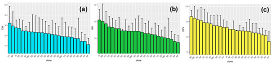 Mean values for phenology and agronomical traits between 21 ‘Malbec’ clones. (a) Cluster weight; (b) Berry number; (c) Days from flowering to veraison. Error bars represent standard error of the calculated means.