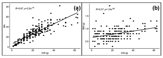 Pearson correlation of cluster weight (CW) and its determinants: (a) berry number (BN) and (b) berry weight (BW).