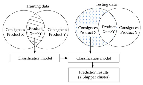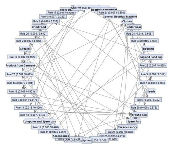 The association rule was used to determine the relationships between product categories and data were separated into two groups—shipper and consignee datasets—to investigate (a) which products are often delivered together and (b) customer behaviors seen when sending/receiving products (Table 3). Association diagrams for hidden product categories are shown in Figure 4.