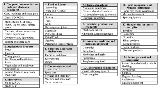 Sales transaction data from 2018 were generated and collected in an Excel spreadsheet. Courier revenue during this year totaled 79 million THB. Attributes collected in the database included shippers’/consignees’ names, dates, times, product group names, product category names, start/destination stations, quantities, weights, freight charges, membership application dates, and payment types (Table 2). Products were originally classified into 66 categories (items), then further aggregated into 13 general groups (Figure 3). The products most frequently transported were food and drink (23%); clothes, garments, and accessories (21%); agricultural products (16%); and furniture, décor/kitchenware (10%), respectively.