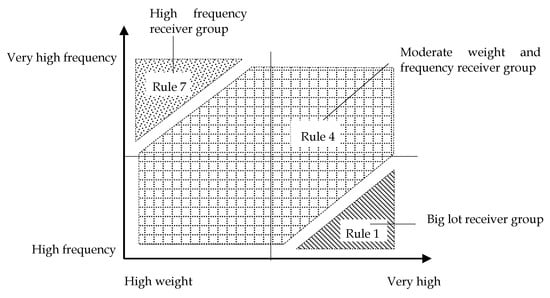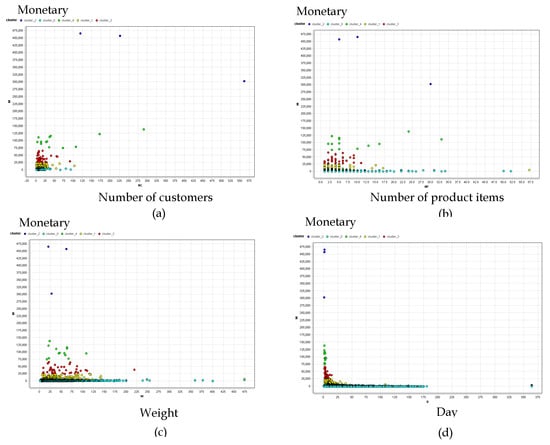 Using the product association example of “Garment product ==> Clothes” clothes shippers and garment products and clothes consignees were divided into groups and five clusters were identified. Cluster_0 was the largest group, with 14,534 shippers. This group delivers products twice a year, with an average of 314 THB spent per year. These shippers are not business organizations, as F, NC, and NP are relatively low. Based on D, which was > 272 days on average, this group does not appear to serve regular customers. The next group, Cluster_2, was comprised of three shippers representing the highest average scores of R, F, M, NC, NP, W, and D. The average number of customers was 302, and the average number of products was 15. D was less than 1 day, and the average weight was 36.3 kg. Cluster_2 is the most interesting group with the most business potential. Meanwhile, Clusters_1, 3, and 4 were made up of groups of shippers with higher average scores than Cluster_0 but still lower than in Cluster_2, with 13, 30, and 288 shippers, respectively. For simple ranking, seven variables were normalized, and simple additive weighting (SAW) was used [87]. This indicated that Cluster_2 was the most preferred target, followed by Clusters_4, 3, 1, and 0 (Table 6). Consignees who receive garment products and clothes were also clustered. Of 2139 consignees, 236 were targeted as potential customers.