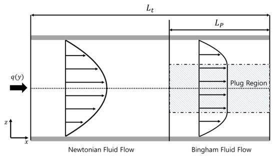 Firstly, the approximate parallel plate model is considered to analyze the flow of MR fluid through general orifice. Figure 8 shows the schematic configuration of the parallel plate model and the corresponding coordinate system. There are dimensions where L is the effective pole length, b is the approximate width, and h is the gap size of orifice. The x-axis represents the direction of flow, the y-axis is the direction along the circumferential direction and z-axis is the direction of the applied magnetic field. If the flow of MR fluid through orifice is steady and the fully developed laminar flow, the behavior of MR fluid can be analyzed using the Newtonian fluid flow region and the Bingham fluid flow region as shown in Figure 9.