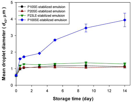 Changes in the mean droplet diameter (volume-length mean diameter, d43) of orange oil-in-water emulsions stabilized with ethylene glycol alkyl ether emulsifiers.