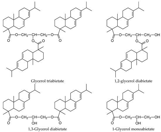 Strongly hydrophobic compounds can be incorporated into the oil phase of essential oil emulsions to inhibit Ostwald ripening [23,24]. Ester gum is widely used in the beverage industry as a weighting agent [1], but it may play a dual role in stabilizing beverage emulsions by also acting as a ripening inhibitor. The main constituents in ester gum are strongly hydrophobic (Figure 3) [25], which means that they have a very low water-solubility. For this reason, we examined the impact of ester gum addition on the stability of model beverage emulsions formulated using different kinds of surfactant.