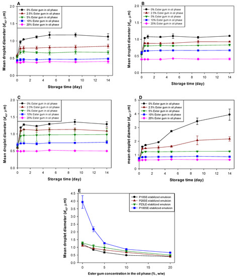 The following are available online at https://www.mdpi.com/2076-3417/10/16/5588/s1. Figure S1: Influence of the addition of ester gum into oil phase on (area-volume mean diameter, d32) of orange oil emulsions stabilized with ethylene glycol alkyl ether emulsifiers. A: P10SE-stabilized emulsion, B: P20SE-stabilized emulsion, C: P23LE-stabilized emulsion, D: P100SE-stabilized emulsions, E: droplet size in emulsions after 14-day storage.