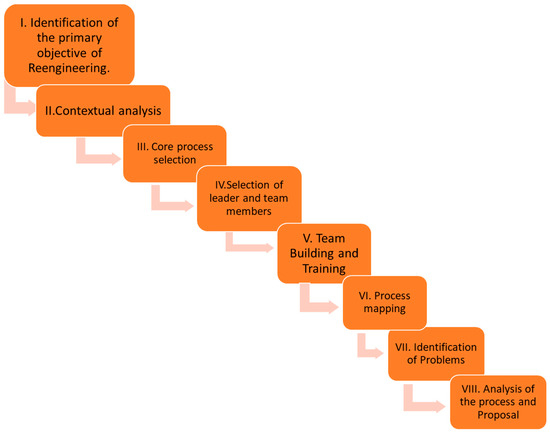 The task arrangement and the excessive control of them are not the appropriate approach to achieve better production times within a productive organization [8]. There are now methodologies where the client plays the most important role and the service provided can be the difference between a company and its competition. It is for this reason that a small improvement fails to position companies, as the offer is extremely huge, and customers are increasingly selective when making purchases. Reengineering achieves dramatic enhancements through a complete redesign of core business processes, combined with rapid implementation, which makes it a strategy when significant changes need to be achieved. At this point, the definition of best fit is to “start again” [1]. According to Manganelli and Klein [9], reengineering is the answer when it is required to optimize workflows and productivity in an organization, as in the case presented in this study. Therefore, there are three types of improvement in the processes of organizations, which include a small improvement in one of the activities of the process, a redesign of the process, that involves changes in all operations, and reengineering, which is a radical redesign that destroys assumptions, builds again, and achieves dramatic changes in some performance measures [1,8].