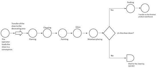Along with the proposal, the process map of the decoration area was made. The process is briefly described below, and a flow diagram is presented in Figure 5. The shoe is taken to the first activity of the decorating area, where the operator performs the flaming, which consists of removing the excess seams that the shoes have through the flaming machine. The next step is carrying the shoe to the work table where 3 to 4 operators are in charge of cleaning, which consists of removing burrs through a razor by taking care that the shoe is not scratched and cleaning the exterior dust. The third activity is placing paint on the soles. Then another operator applies the polish gloss. Then an operator places a paper inside the shoe for interior protection, and the shoelace is placed on the shoe and, thus, the shoe is finished. If the shoe is clean, it is packed and labeled according to the characteristics of the shoe. Otherwise, a cleaning operator is asked to clean it again and when it is ready it is packed. Lastly, an operator stows the boxes, until obtaining five pairs of shoes and placing a safety clasp through the strapping machine to transport to the “Finished Product Warehouse” area. In addition, the team takes times of the operations of both decorating lines in order to analyze the process.