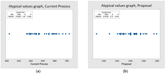 First, a Kolmogorov-Smirnov test was applied to evaluate if the data can be reasonably approximated by a normal distribution before applying the Grubbs test. It was concluded that both the data of the current process and those of the proposal have a normal distribution because the value is greater than the value of . Then, the Grubbs test was made (see Figure 11).