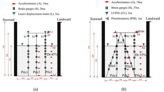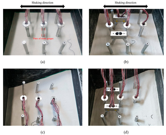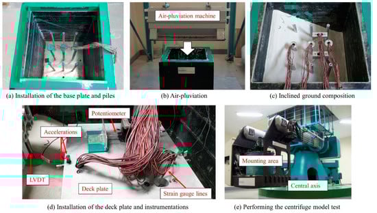 Certain sections of the pile-supported structures at the Port of Pohang, Korea, were modeled for the tests. This study used experimental models previously tested by Yun et al. [24]. Figure 2 shows the testing procedure of the HAI55 model in detail. First, the base plate and the piles were installed to the equivalent shear beam (ESB) box, and the relative density of the ground was adjusted through the air pluviation method. The inclined ground was composited, and the test was performed after installing the deck plate and the instrumentations. The soil was simplified to a single-component sandy soil. Figure 3 shows the four model configurations tested. Models HA45 and HAI55 had horizontal grounds with relative densities of the soil being 45% and 55%, respectively. Models IA62 and IAI58 had inclined grounds with relative densities of the soil being 62% and 58%, respectively. Models HA45 and IA62 had nine piles in the 3 × 3 arrangement shown in Figure 4a,c. Models HAI55 and IAI58 had a similar 3 × 3 pile arrangement with four additional batter piles, as shown in Figure 4b,d. Each model was 1/48 in scale, and the specifications were calculated by adjusting the flexural rigidity, which has the highest impact on structural behavior during an earthquake. Table 1 presents the scaling laws linking the prototype and the model, and Table 2 lists their properties. The model piles and deck plates were made of aluminum (elastic modulus, E = 68,300 MPa; Poisson’s ratio, ν = 0.3) [25,26,27].