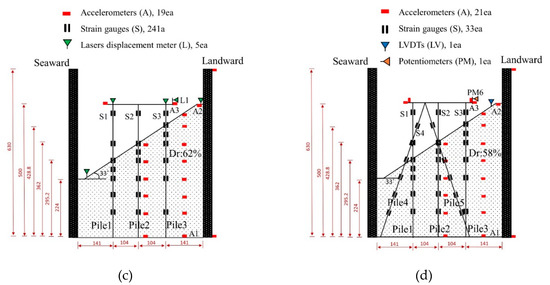 The tests were conducted in dry sand to minimize the effects of liquefaction and lateral spreading on the piles, which can occur when considering pore water pressure. The tests used silica sand with an average particle diameter (D50) of 0.3 mm, the basic properties of which are listed in Table 4. The sand used in this test was classified as poorly graded sand (SP) according to the Unified Soil Classification System. It had a coefficient of uniformity () of 1.96, and its coefficient of curvature () was 1.16. Its specific gravity () was 2.63, maximum dry unit weight was 16.5 kN·m−3, and its minimum dry unit weight was 12.4 kN·m−3. As explained earlier, the relative density of the ground was adjusted by air pluviation. However, minor differences were observed in the relative density of each model due to a defect in the air pluviation machine. The piles were fixed to the base plate to simulate the end-bearing pile. Laser displacement meters, potentiometers, linear variable differential transformers (LVDTs), accelerometers, and strain gauges were used, as seen in Figure 2 and Figure 3. Figure 3a,c show the positions of the laser displacement meters used to derive the displacement. These displacement meters easily measure the residual displacement but cannot accurately measure the displacement value over time. Therefore, as seen in Figure 3b,d, displacements were derived using LVDTs and potentiometers that measure displacement over time.