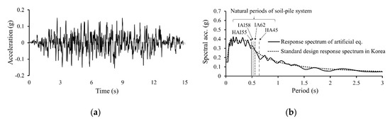 Artificial seismic waves (Figure 5a), suitable for Korean sites, were produced, as specified by the Ministry of Oceans and Fisheries (MOF) [19]. The design ground acceleration, considering the ground characteristics, is expressed as a response spectrum curve, and a 5% damping ratio is generally applied. Figure 5b compares the response spectrum curve of the artificial seismic wave and the standard design response spectrum curve, showing their close agreement. Figure 5b also shows the natural periods of the soil-pile system of each model of the centrifuge model test. It shows the natural periods of 0.5–0.65 s. As the confining pressure of the ground near pile 3 (landward pile) was larger in the inclined ground model (IA62) than in the horizontal ground model, the ground stiffness was relatively higher than that in the horizontal ground model (HA45). This resulted in a smaller natural period in the inclined ground model (IA62) than the horizontal ground model (HA45), as shown in Figure 5b. Table 3 lists the base input seismic motion applied to each model.