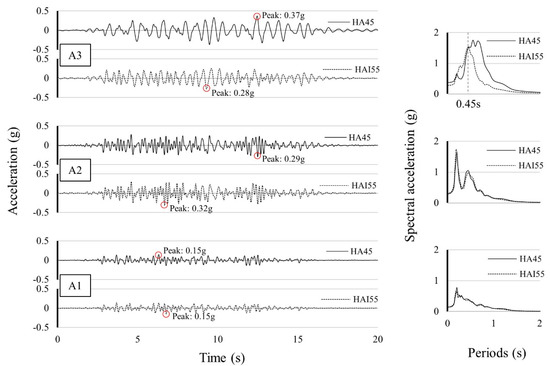 Figure 6 and Figure 7 compare the acceleration time history and response spectrum curves of each model; all the test data show the prototype response. Figure 6 shows the responses of the horizontal-ground models (HA45 and HAI55) for a peak input acceleration of 0.15 g. Results for the bedrock and ground surface acceleration (A1, A2) show a similar trend for the two models, despite a 10% difference in their ground relative densities. In contrast, their deck plate accelerations (A3) were varied significantly. Particularly, when the batter piles were installed, the response decreased in the long-period region (≥0.45 s) as the stiffness of the system increased.