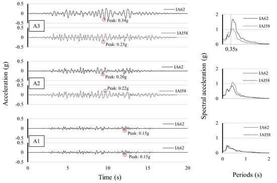 Figure 7 shows the responses of the inclined-ground models, IA62 and IAI58, to a peak input acceleration of 0.12 g. The results for the bedrock and ground surface acceleration (A1, A2) show no significant difference in model responses. In contrast, their deck plate accelerations (A3) were varied greatly. Even in the case of the inclined ground model, when batter piles were installed, the response decreased in the long-period region (≥0.35 s) as the stiffness of the system increased.