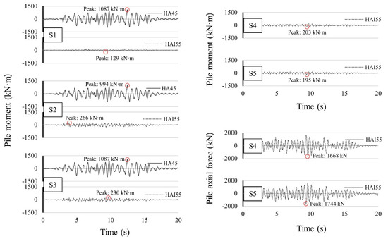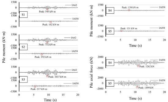 Figure 8 shows the responses of models HA45 and HAI55 (0.15 g), and Figure 9 shows those of models IA62 and IAI58 (0.12 g). As shown in Figure 7, the installation of batter piles to the horizontal-ground model significantly reduced the moments of the vertical piles (S1–S3), whose maximum moment was reduced by 88%, 73%, and 79%, respectively. The axial forces (S4, S5) of the batter piles were large, up to a maximum of 1744 kN. Figure 9 shows similar results wherein the batter piles reduced the maximum moments of the vertical piles (S1–S3) by 70%, 74%, and 79%, respectively, and the axial forces (S4, S5) of the batter piles were very large, up to a maximum of 1499 kN.