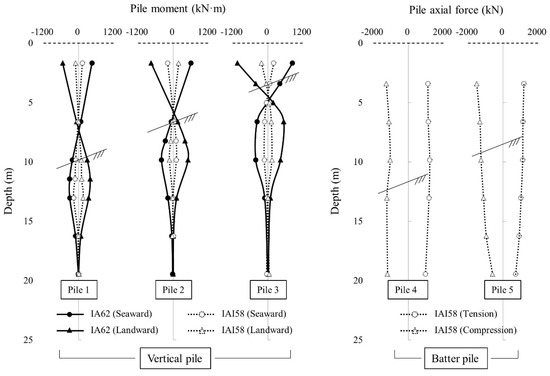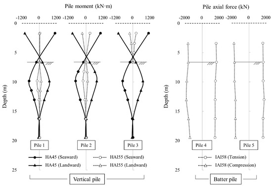 - M–N interaction diagrams were derived to evaluate the cross-sectional stress where both the bending moment and axial force occurred simultaneously. When the batter piles were installed, the combined stress ratios, of up to 0.62 in the horizontal ground, and up to 1 in the inclined ground, were reduced, showing efficient performance in the inclined ground. Even when the sectional stress originally exceeded the allowable stress, the batter piles could reduce it to within the allowable limit to secure member stability.