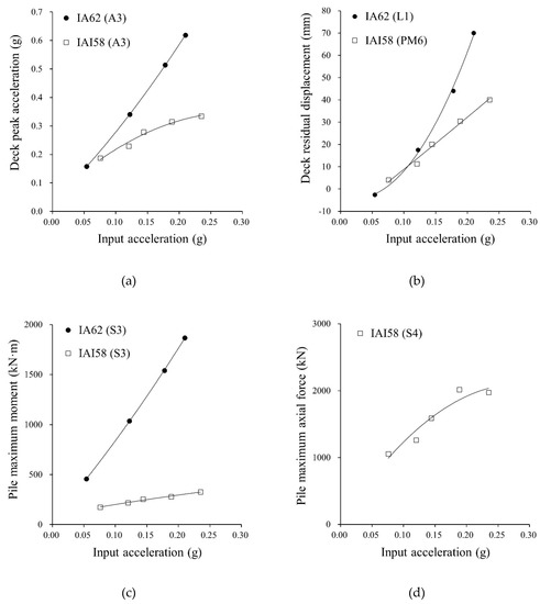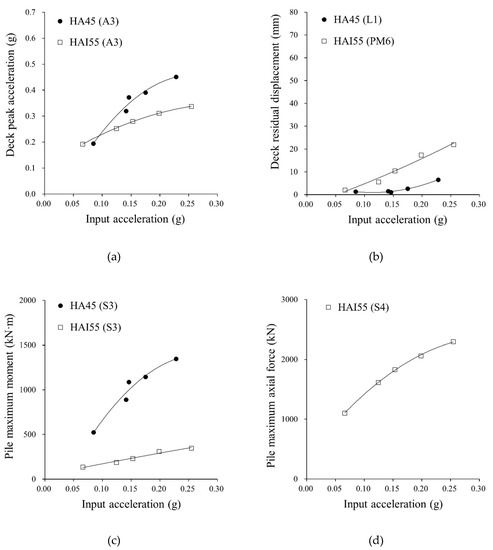 Figure 12 and Figure 13 plot the peak acceleration of the deck plate (A3), the horizontal residual displacement of the deck plate (L1, PM6), the maximum moment of the vertical piles (S3), and the maximum axial force of the batter piles (S4), corresponding to the input acceleration for each model. The vertical pile moments were derived at the pile top (S3), where the maximum moment was observed. The plotted axial forces of the batter piles were also derived at the pile top (S4). As four to five datasets were derived per test in this study, regression analysis curves were also plotted to obtain the intermediate value. Quadratic polynomials were derived using the least square method.